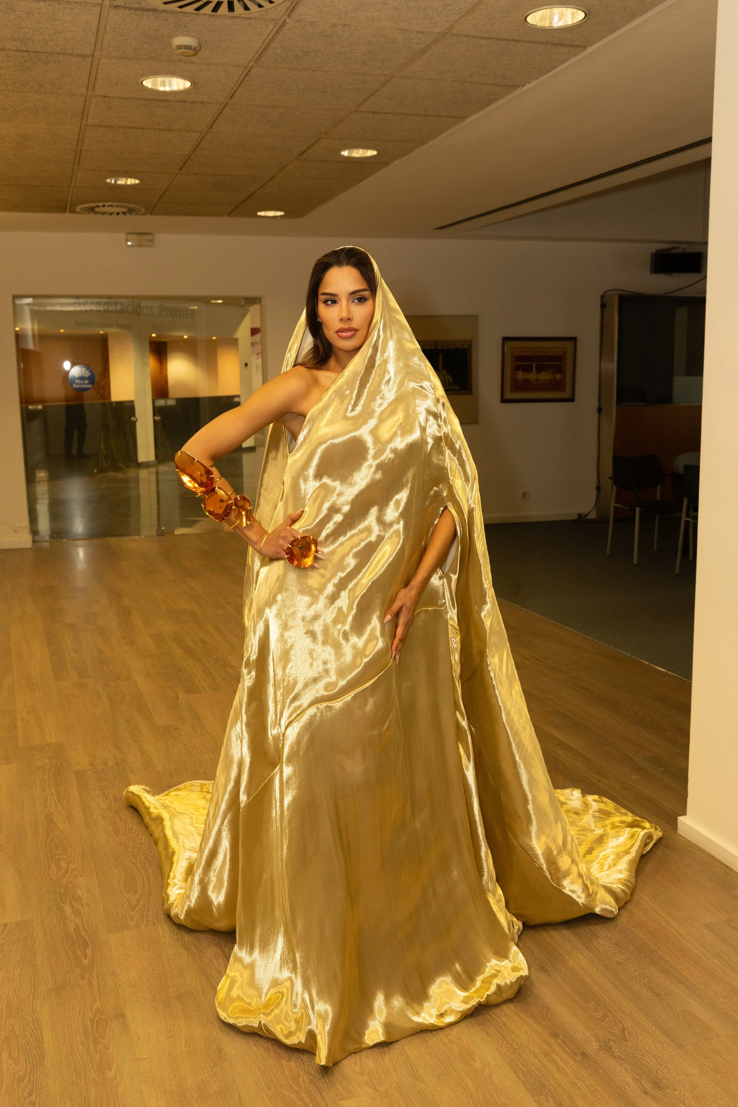 For the show, I had the honor of wearing two incredible looks from Stéphane Rolland’s archive. The first, a striking golden cape paired with the most exquisite accessories, delicate stones in warm brown tones blended with gold, creating something truly unforgettable.